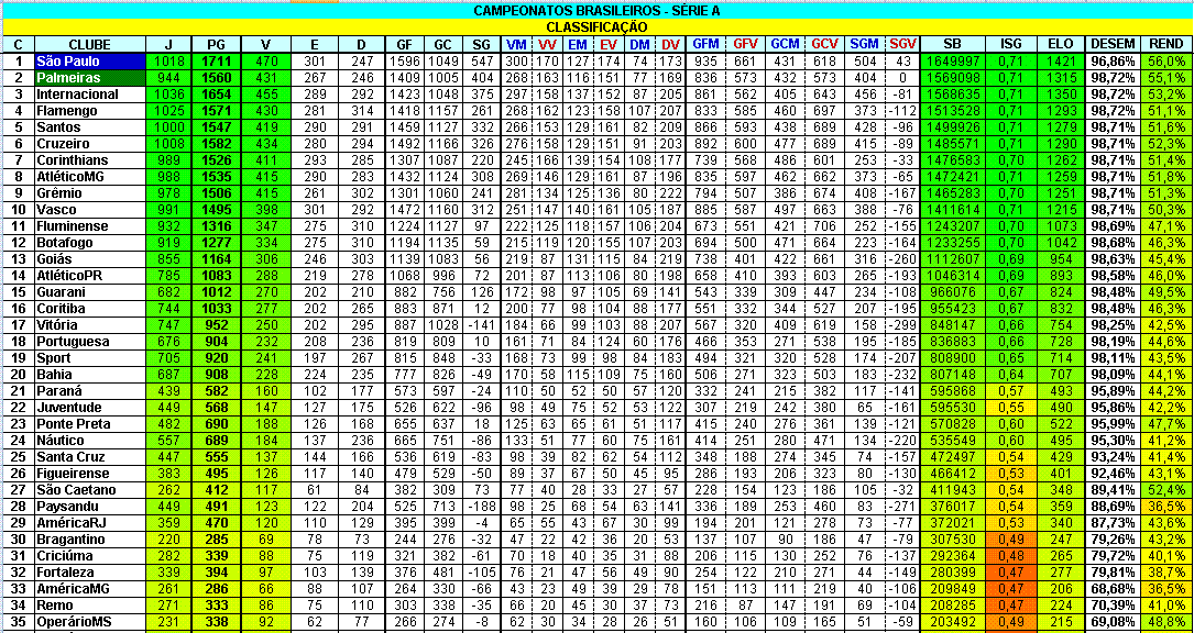 Há algumas semanas recebi do Biá, pai de um grande amigo, um ranking dos clubes de futebol do Brasil de acordo com a participação em Campeonatos Brasileiros, desde 1971, quando houve a primeira edição. Já existe um ranking que a CBF divulga, que leva em consideração: as competições promovidas pela Confederação, clubes que participam de mais competições e clubes mais bem colocados nas maiores competições, também desde 1971.