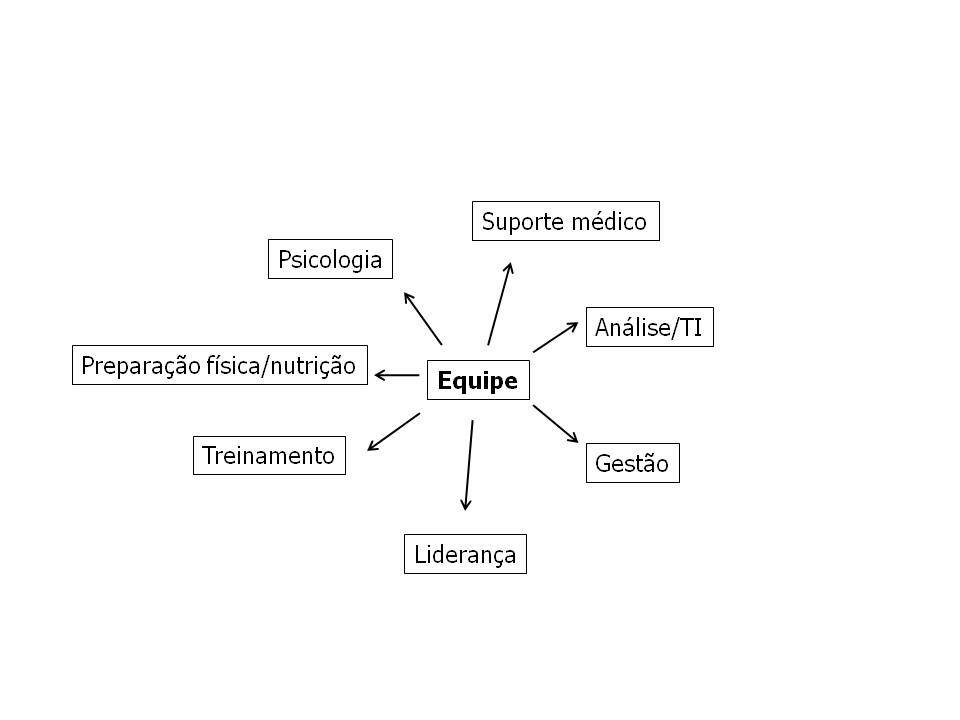 Liderança: é importante para a delegação. São as referências e os exemplos do grupo. Treinamento, que é fundamental para a obtenção dos resultados esportivos, para a condução do jogo que o treinador julgar necessário. Preparação física e nutrição, para a execução dos treinamentos e a realização do jogo. Psicologia, para que o treinador tenha em mãos peças saudáveis não apenas em corpo, mas em mente. Suporte médico para que o grupo esteja em condições ideais de atuar e que os jogadores estejam prontamente recuperados em tempo de atuar; análise/TI porque as estatísticas são importantes para que pontos fortes e deficiências da equipe sejam verificados e seus erros, minimizados. Por fim, a gestão de toda essa delegação, que fornece as condições e necessárias para o trabalho de todos eles.