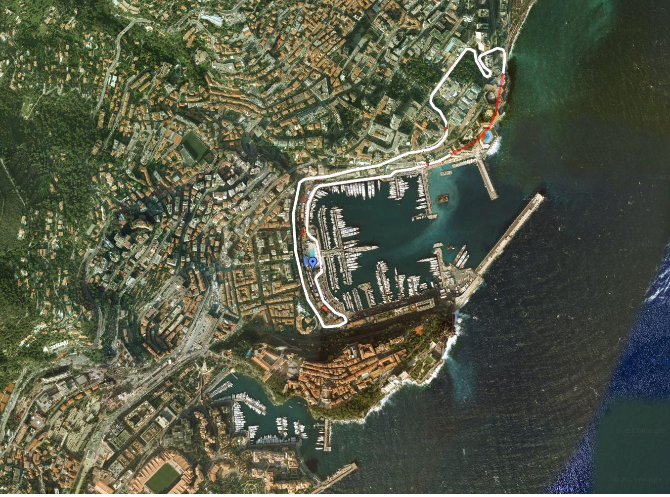 O Principado de Mônaco (com o circuito em linha branca/vermelha) visto do satélite